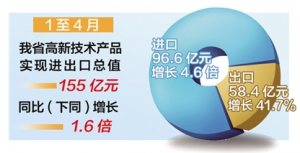 制图/展茂光 本报讯(记者邢杰冉通讯员杨宝丽)据石家庄海关统计,1至4月,我省高新技术产品实现进出口总值155亿元,同比(下同)增长1.6倍。其中出口58.4亿元,增长41.7%;进口96.6亿元,增